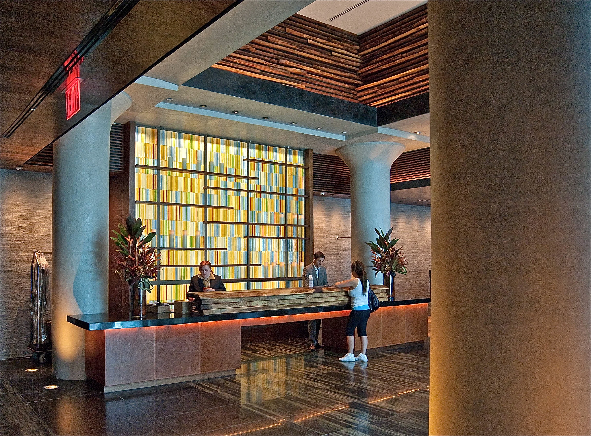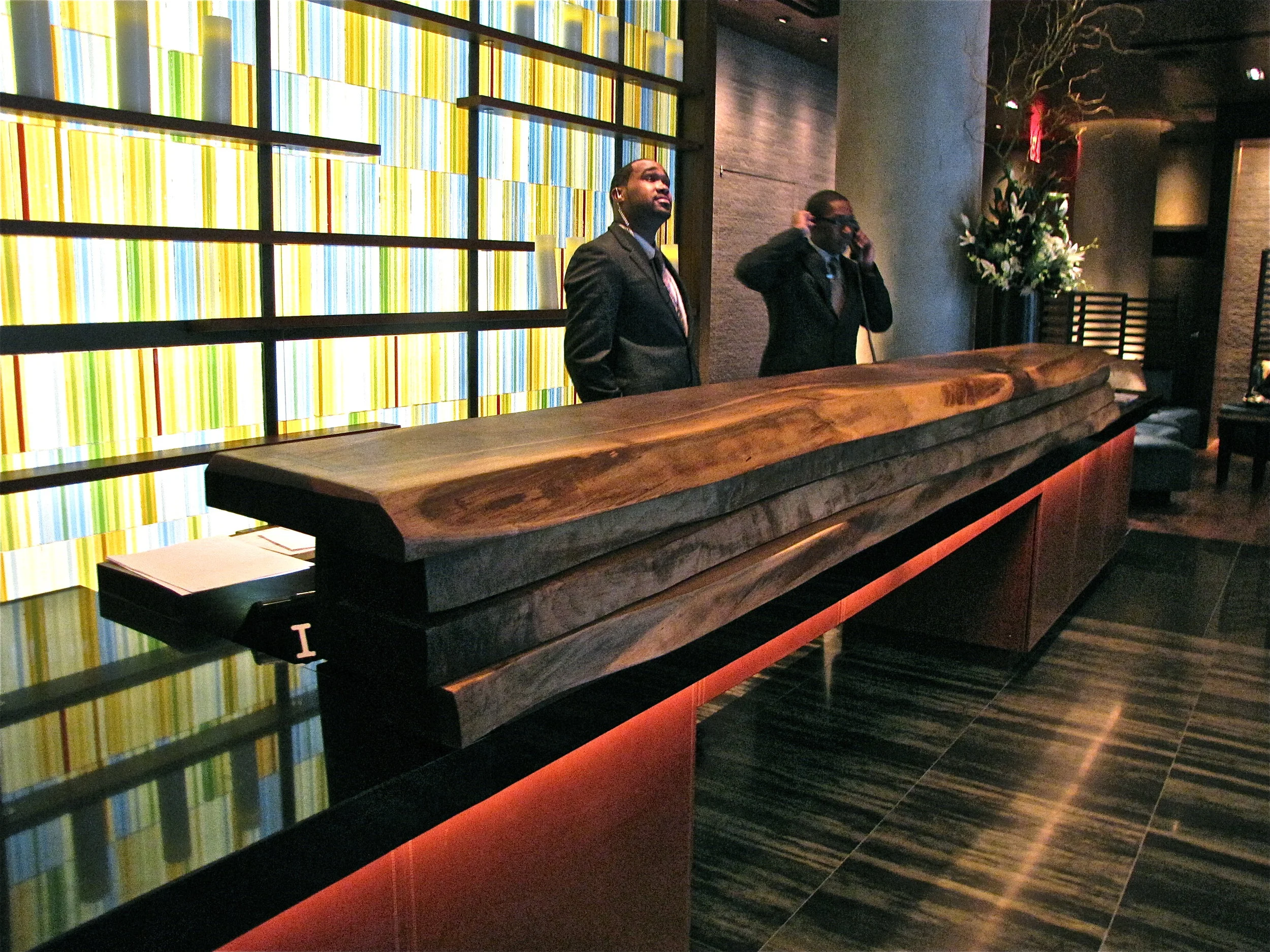 Ink 48 Hotel Lobby NYC; Reception desk (live edge walnut, marble, leather), Colored glass feature wall, Live edge walnut soffit